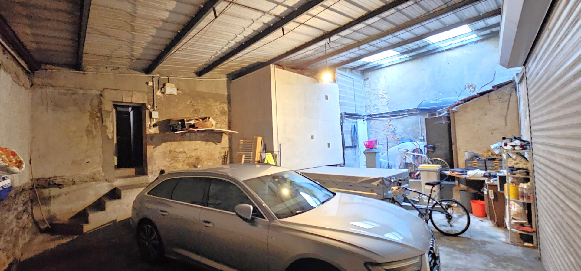 Le rez-de-chaussée se compose d’une entrée avec dégagement desservant une salle de réception aujourd’hui utilisée en bureau, une chambre avec point d’eau, une seconde chambre avec salle de bains attenante, ainsi qu’un grand garage de plus de 60 m².