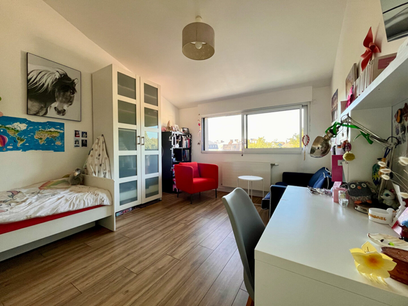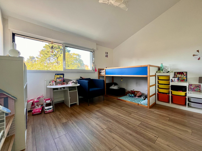 Elle se compose au rez de chaussée d’une grande pièce de vie avec baie vitrée à galandage donnant sur un jardin parfaitement arboré avec terrasse. Une belle cuisine séparée avec électroménager haut de gamme et un garage.