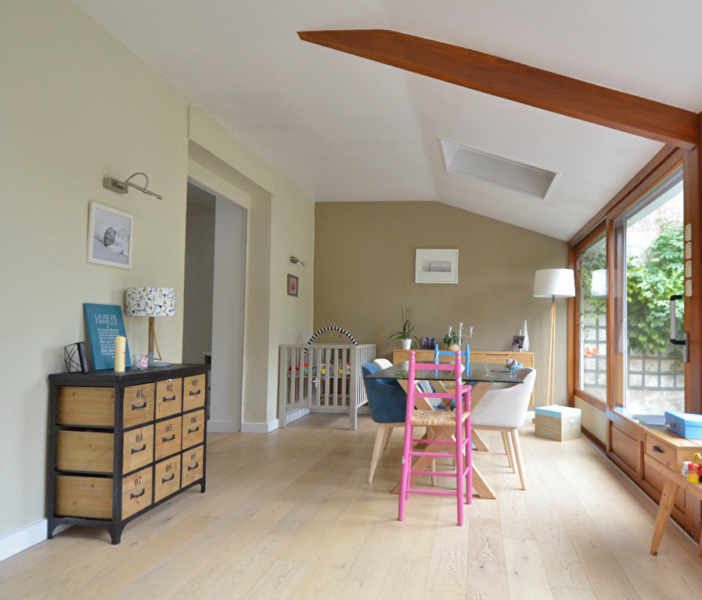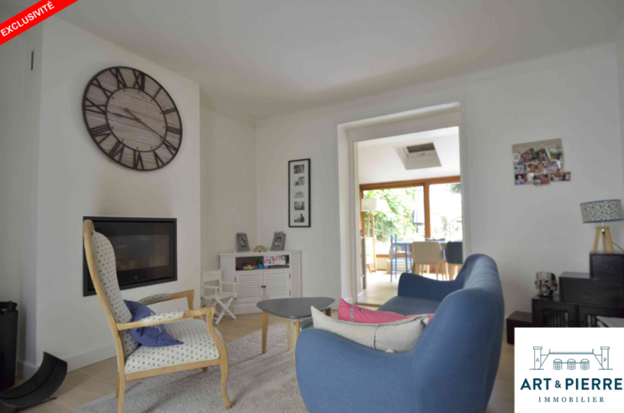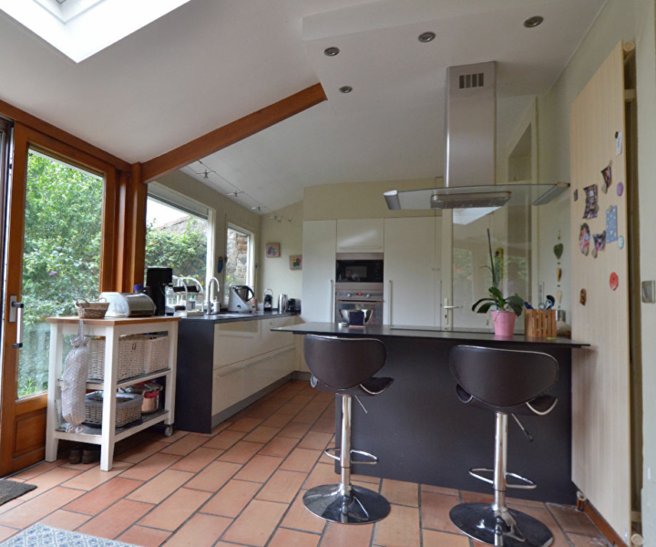 Très jolie maison familiale comprenant de plain-pied une belle pièce de vie de 29m2 avec salle à manger et cuisine ouverte , un salon chaleureux avec cheminée à insert , et un bureau bibliothèque