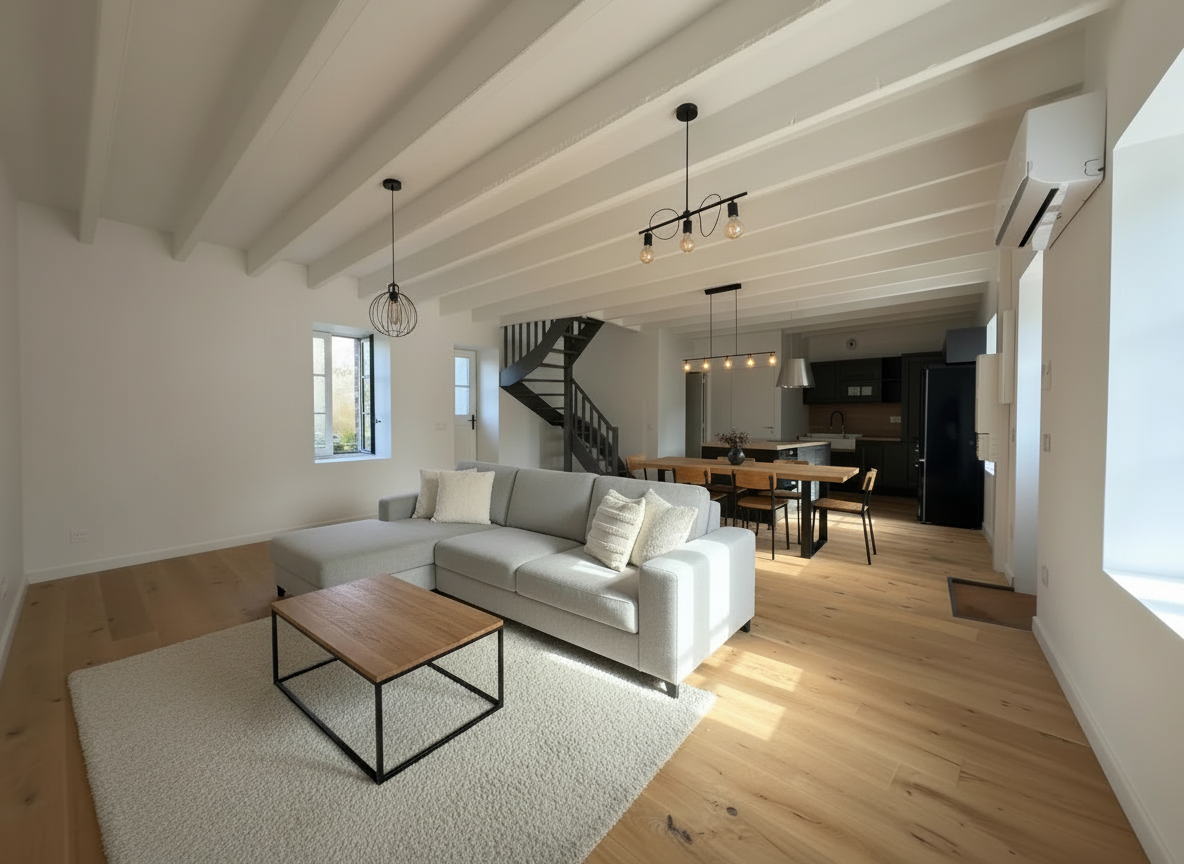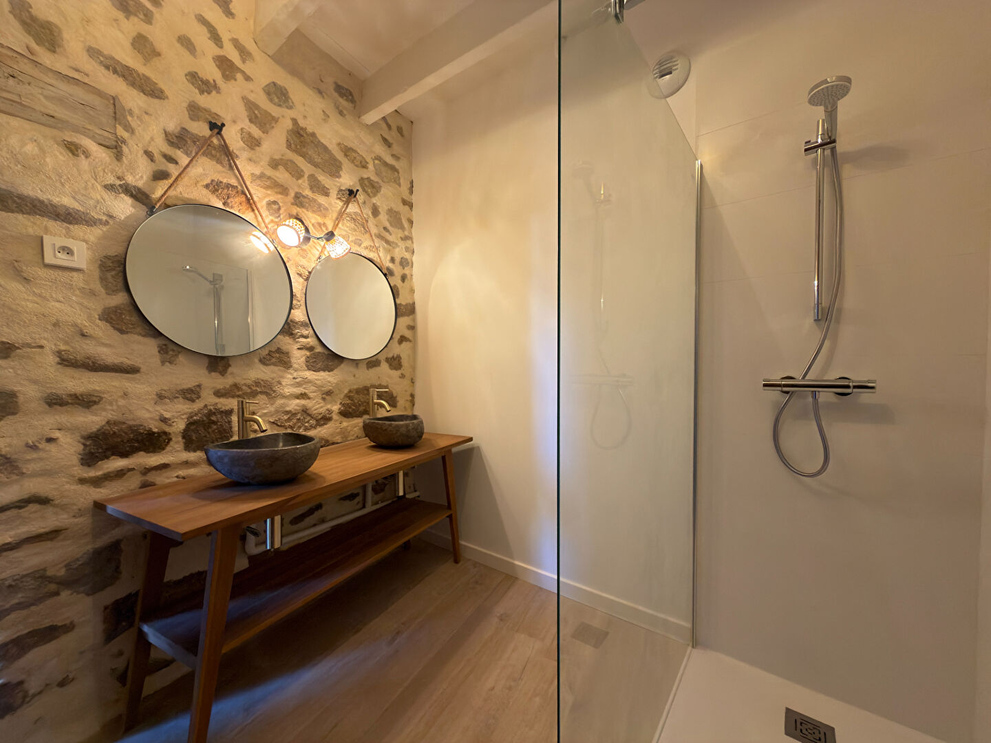 Cette maison entièrement rénovée avec goût, a su garder les éléments de charme de l’ancien (poutres, pierres apparentes…)