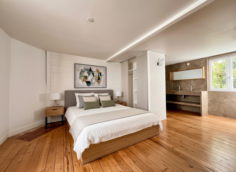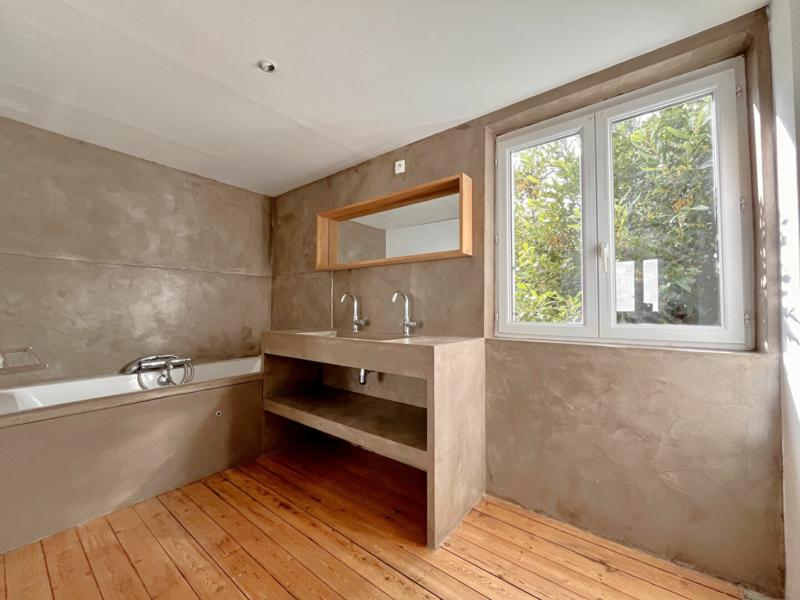 A l’étage, un pallier dessert une chambre parentale avec salle de bains ouverte, deux chambres supplémentaires et une salle d’eau avec WC.