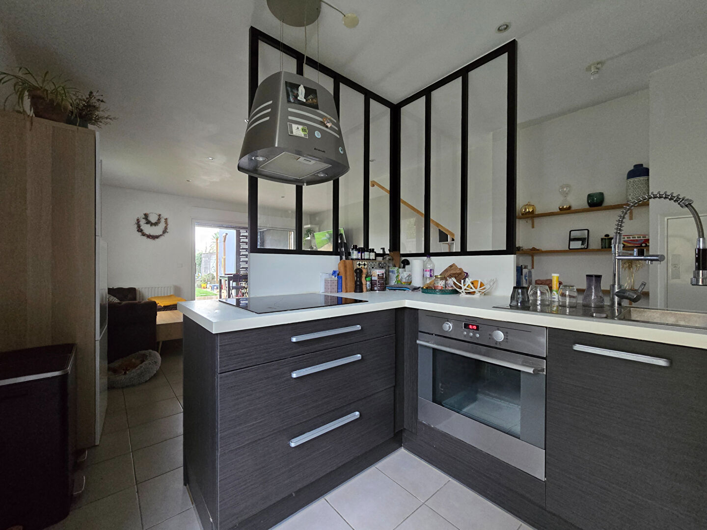 La maison s’ouvre sur une entrée, un espace de vie chaleureux et lumineux grâce à son exposition Sud avec une cuisine ouverte aménagée et équipée doté d’une verrière.
