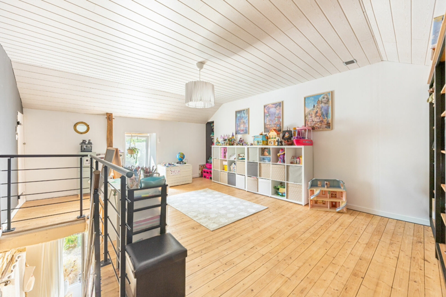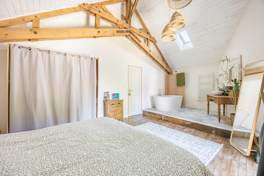 A l’étage, une vaste mezzanine de 25 m² dessert deux autres chambres, dont une magnifique suite parentale sous plafond cathédrale. Un grenier et un WC séparé complètent ce niveau.