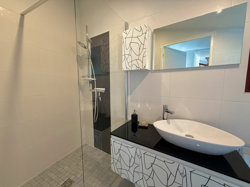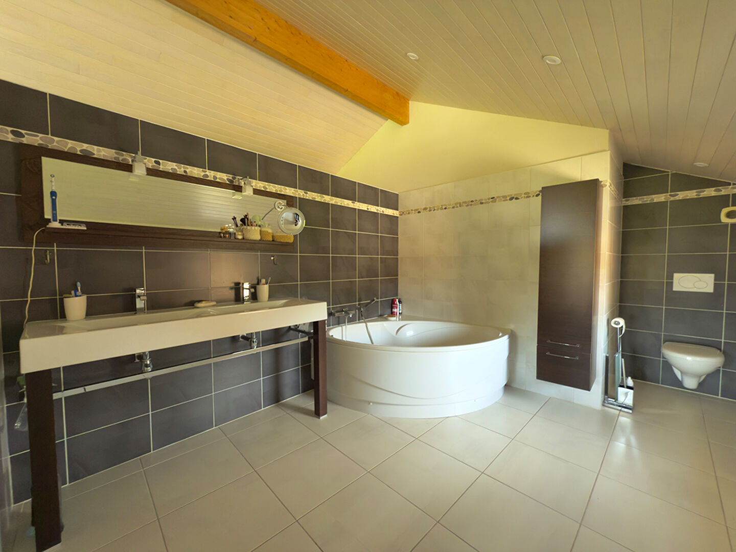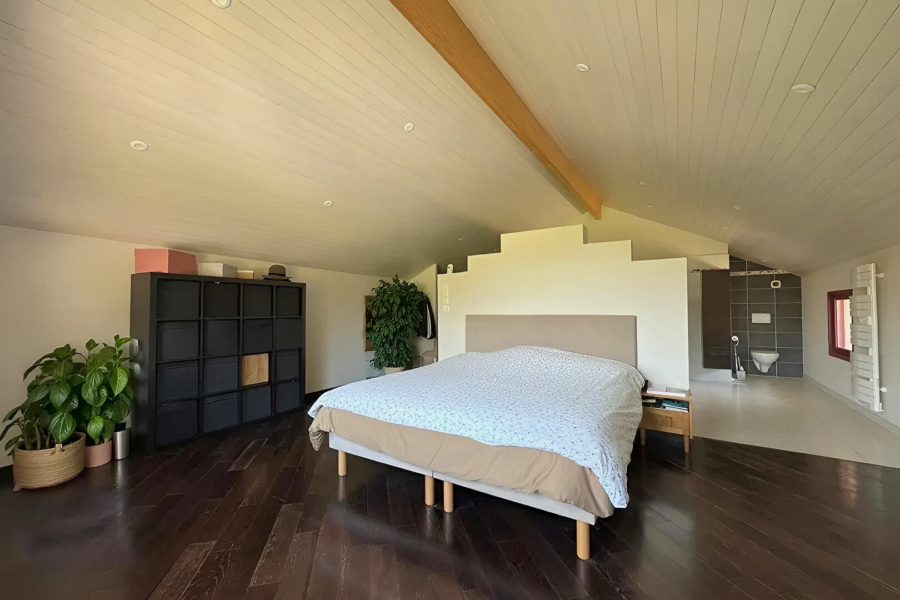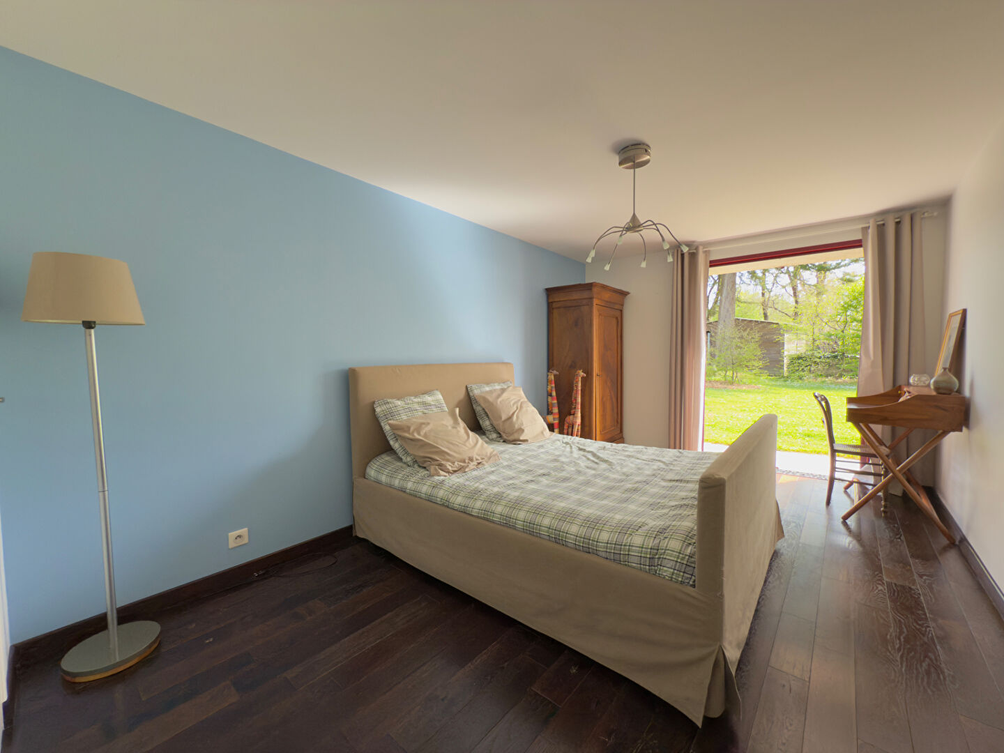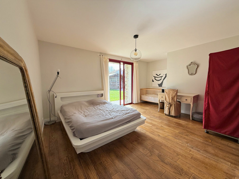 Côté nuit, la maison propose quatre chambres confortables, dont deux avec salle d’eau privative, une grande chambre avec placards, une chambre avec vue sur le parc, ainsi qu’une suite parentale à l’étage avec dressing et salle de bains équipée d’une baignoire d’angle. Un bureau lumineux avec vue dégagée complète l’espace intérieur, idéal pour le télétravail ou une activité indépendante.