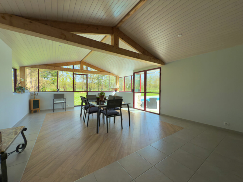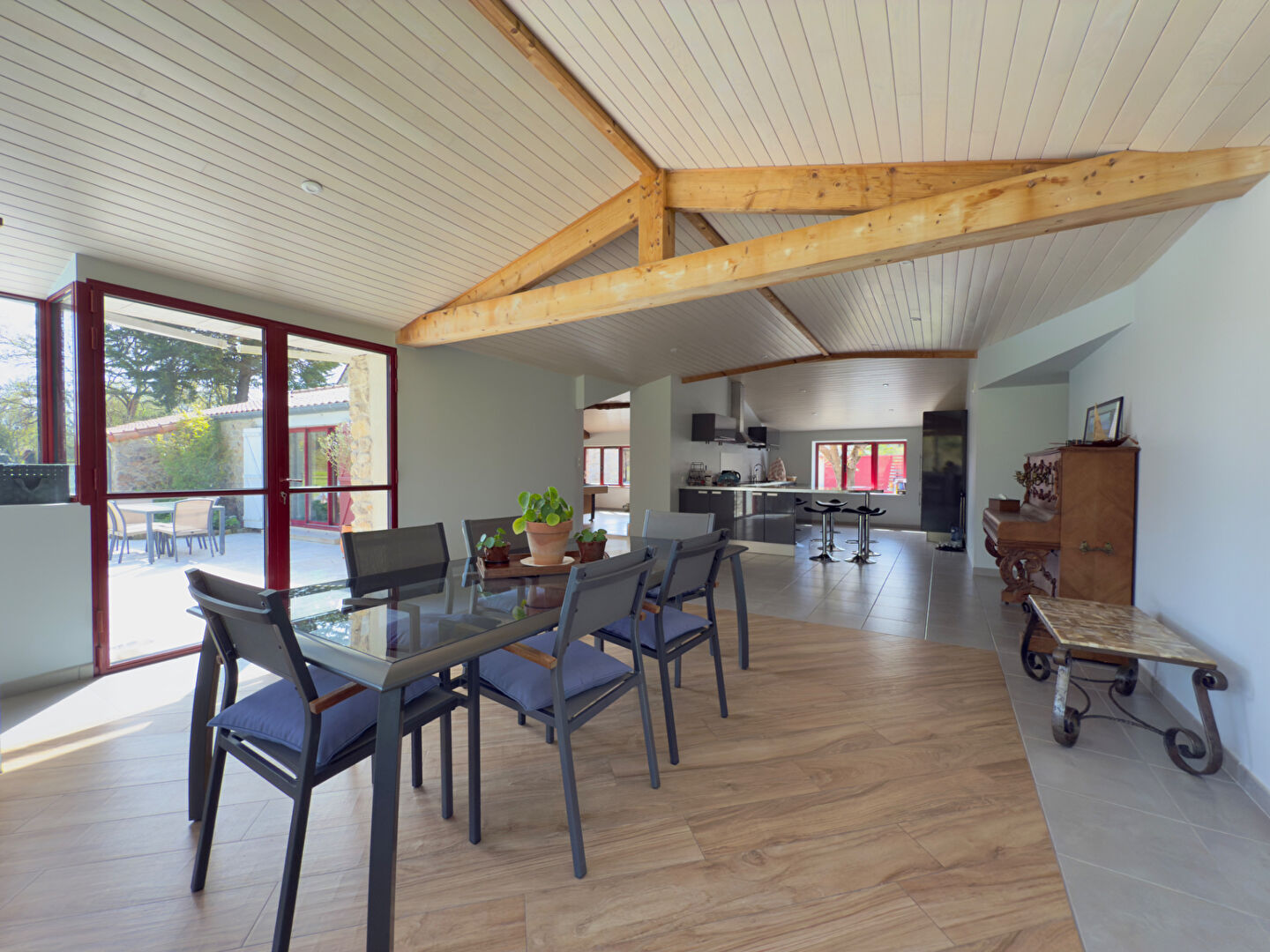 La pièce de vie, baignée de lumière, se compose d’une cuisine aménagée et équipée, d’une salle à manger sous verrière, et d’un vaste salon offrant une vue panoramique sur le parc arboré et la piscine chauffée.