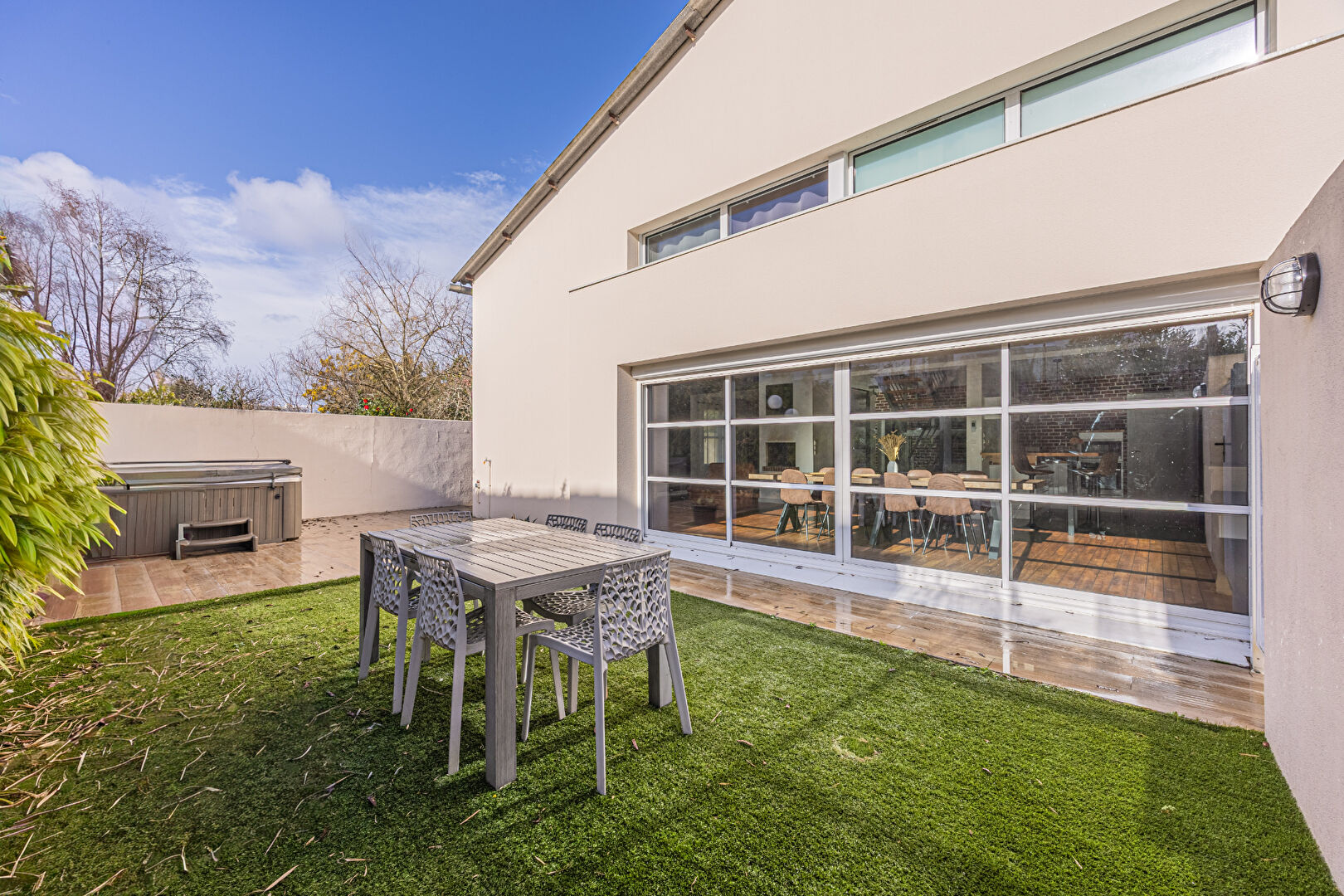 Dès l’entrée, vous serez séduits par une magnifique pièce de vie de plus de 60 m², baignée de lumière grâce à ses grandes baies vitrées et agrémentée d’une cheminée, idéale pour des moments chaleureux en famille. L’espace s’ouvre sur un jardin avec terrasse exposée plein sud, équipé d’un spa chauffé, parfait pour profiter des beaux jours en toute intimité.