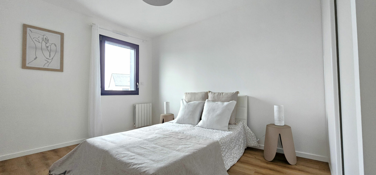 A l’étage, vous trouverez un grand palier intégrant un espace dédié au télétravail, trois chambres avec placards et une belle salle de bains, fonctionnelle et élégante.