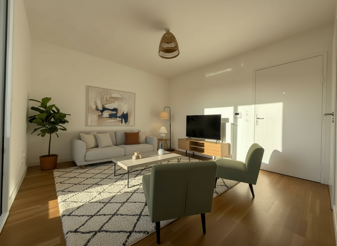 La pièce de vie lumineuse avec cuisine ouverte s’ouvre sur un balcon offrant une vue dégagée.
