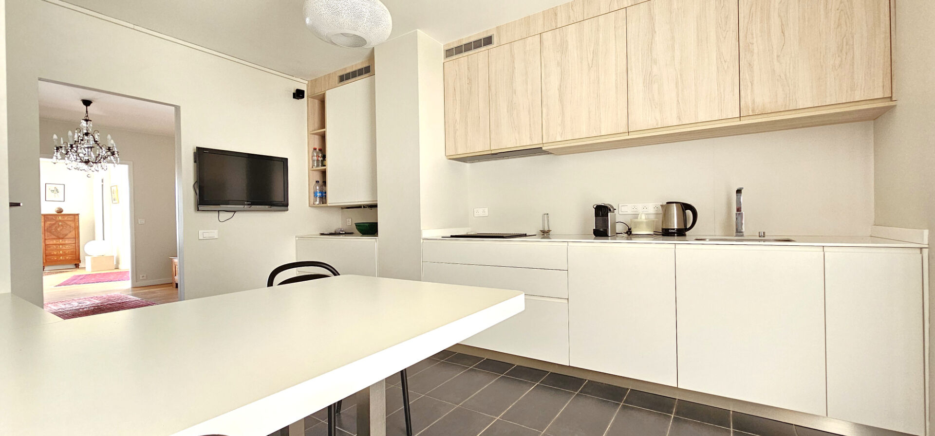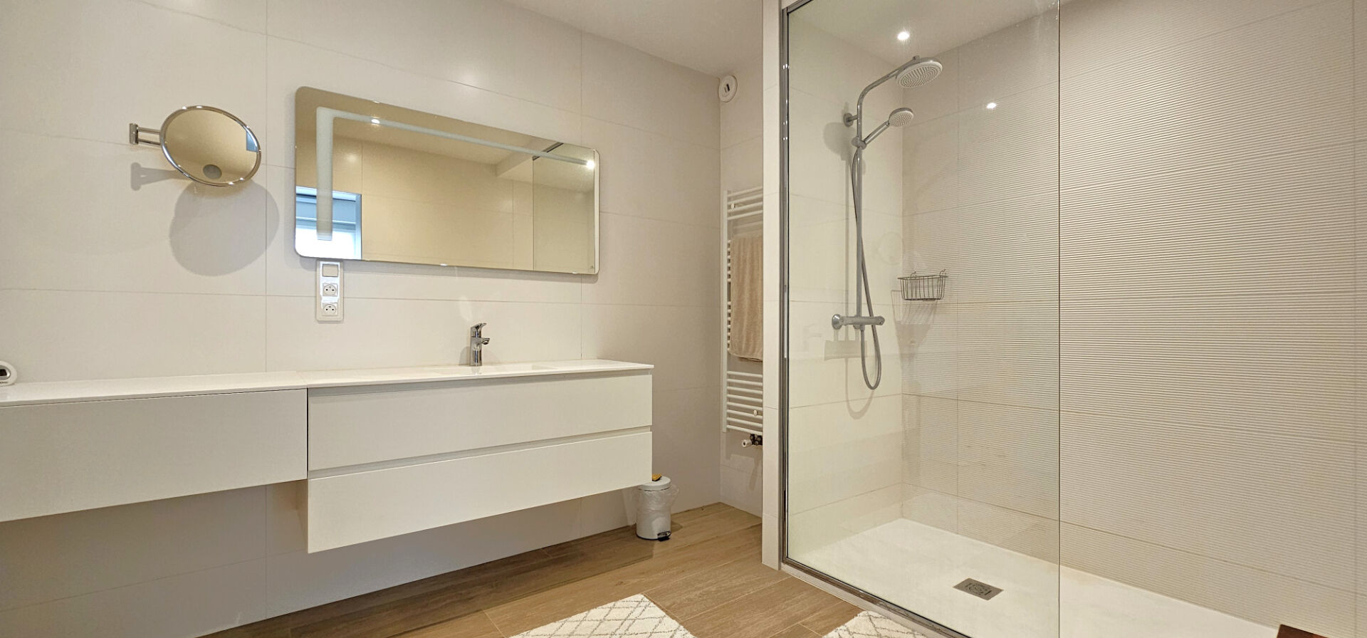 Situé au cinquième étage avec ascenseur, il déploie une entrée, un séjour salle à manger sur parquet donnant sur une grande terrasse, un dégagement avec placards, une cuisine haut de gamme entièrement aménagée et équipée, deux chambres, dont une avec salle d’eau et dressing, une salle de bain, une buanderie et un WC. A l’étage, trois chambres dont une suite parentale avec dressing et salle d’eau, une seconde salle d’eau et un WC.