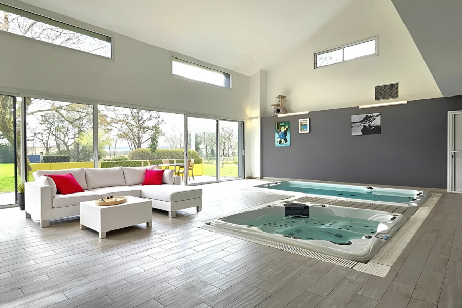 Entièrement tournée vers l’extérieur, elle séduit par ses vastes espaces de plain-pied, baignés de lumière et ouverts sur une terrasse plein sud. Son immense pièce de réception d’environ 150 m² côtoie une cuisine aménagée et un salon détente avec piscine intérieure et jacuzzi, pour des moments de relaxation absolue.