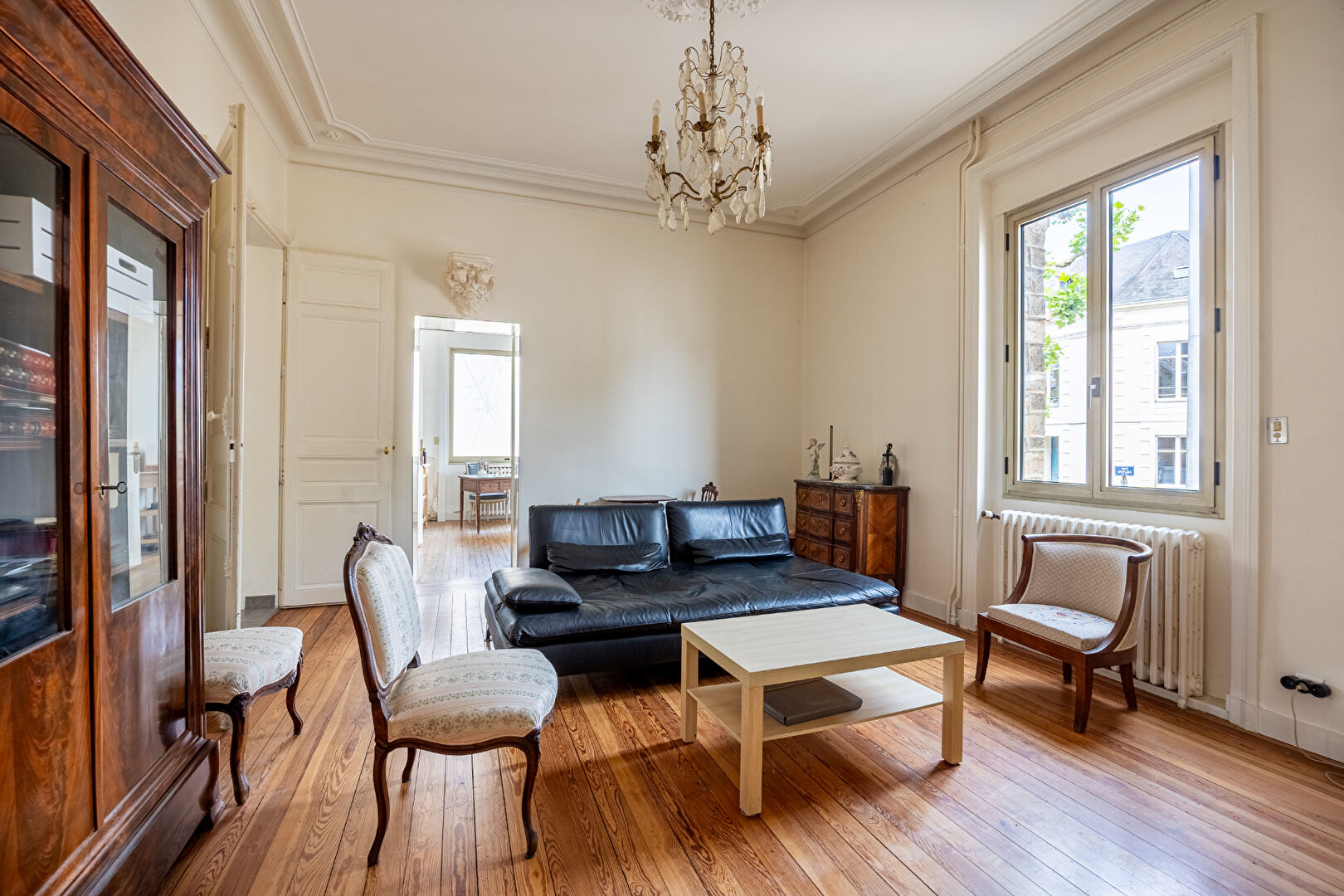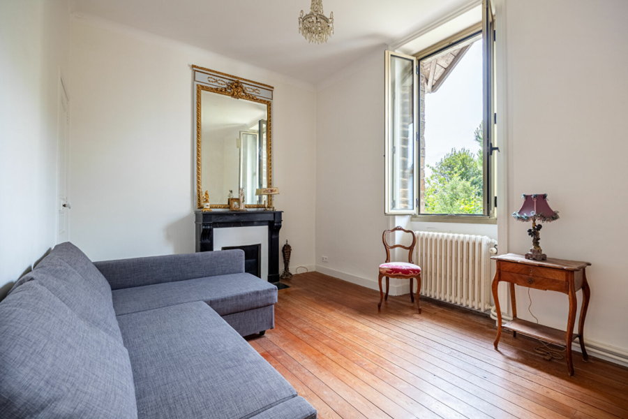 Lumineuse et traversante, elle distribue une vaste cuisine aménagée et équipée ouverte sur une belle pièce de vie donnant sur le jardin, deux salons sur parquet ancien, une salle d’eau et un wc.