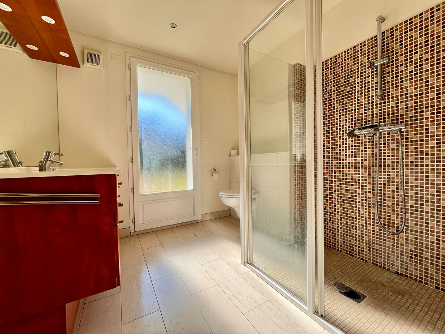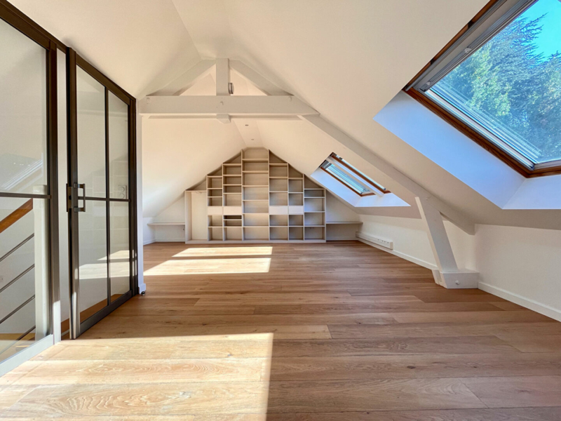 Au deuxième étage, une vaste suite parentale récemment rénovée avec espace nuit aménagé d’un grand dressing, un bureau, un Wc et la possibilité de créer une salle de bains.